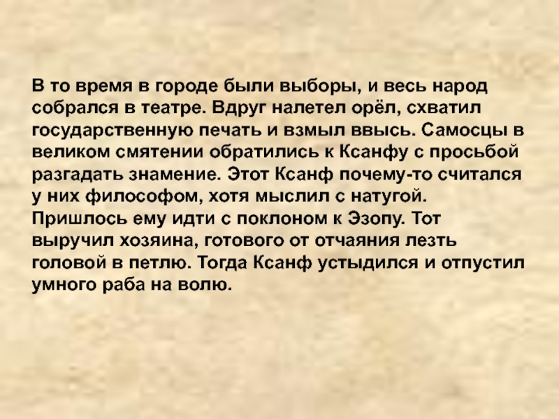 Заговорив, Эзоп оказался настолько остроумен, что хозяин вознамерился избавиться от него и дёшево сбыл одному работорговцу, который, в свою очередь, продал Эзопа за семьдесят пять мелких серебряных монет на остров Самос Ксанфу-философу.
