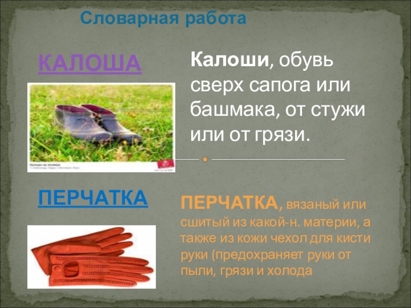 ПЕРЧАТКА, вязаный или сшитый из какой-н. материи, а также из кожи чехол для кисти руки (предохраняет руки от пыли, грязи и холода