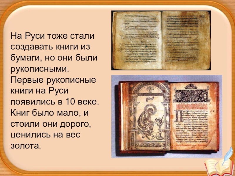 Слайд 16На Руси тоже стали создавать книги из бумаги, но они были