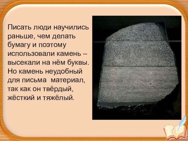 – высекали на нём буквы. Но камень неудобный для письма материал, так как он твёрдый, жёсткий и тяжёлый.