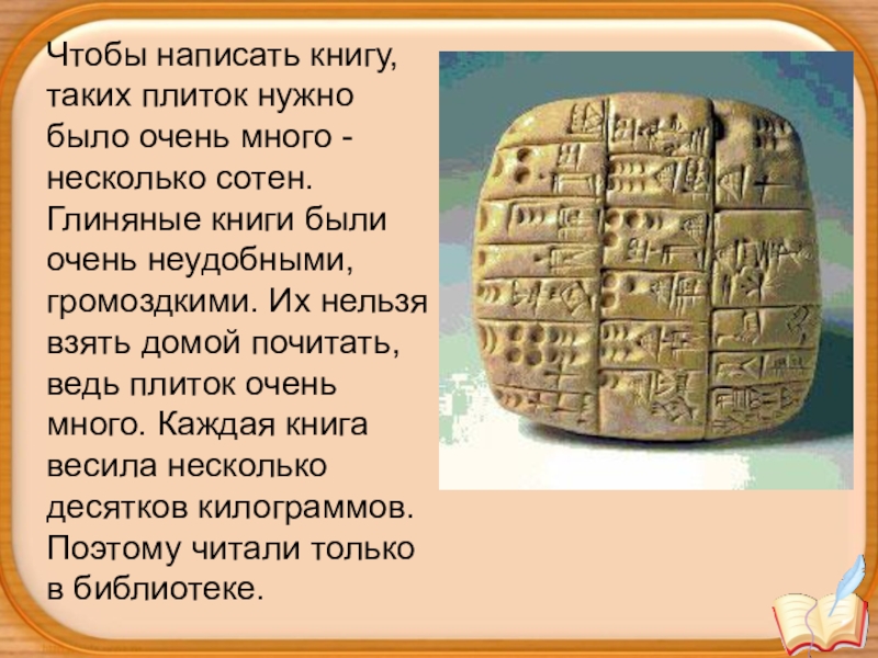 сотен. Глиняные книги были очень неудобными, громоздкими. Их нельзя взять домой почитать, ведь плиток очень много. Каждая книга весила несколько десятков килограммов. Поэтому читали только в библиотеке.
