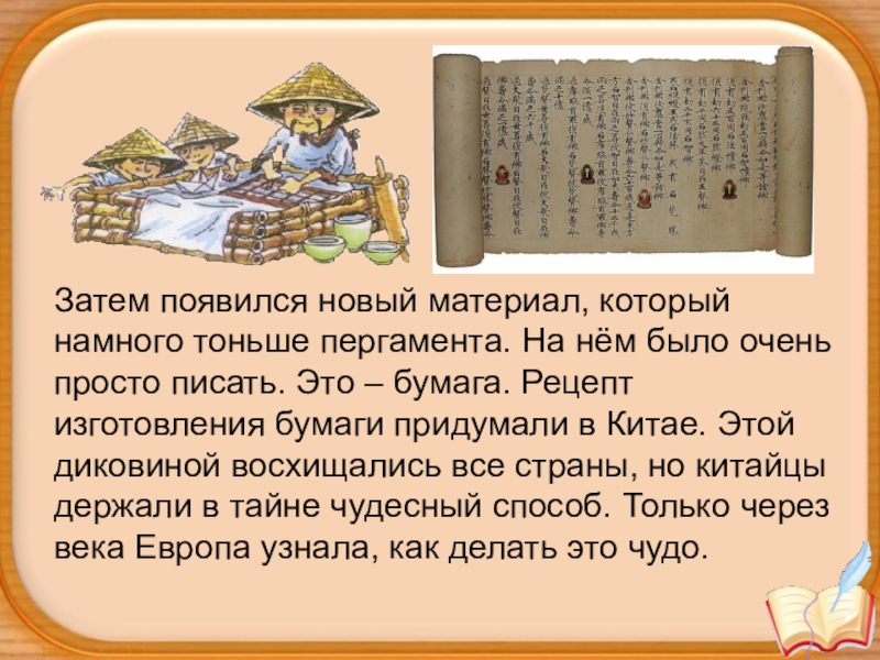 Слайд 15Затем появился новый материал, который намного тоньше пергамента. На нём было