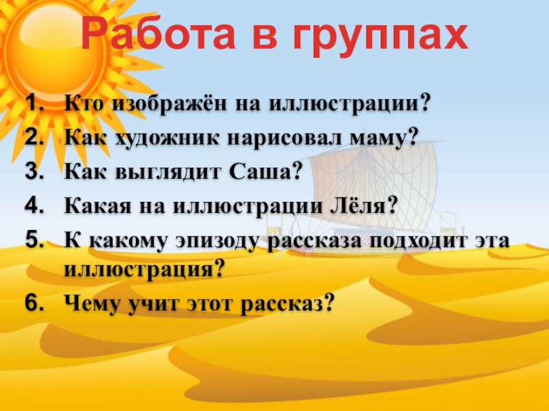 Работа в группахКто изображён на иллюстрации?Как художник нарисовал маму?Как выглядит Саша?Какая на иллюстрации Лёля?К какому эпизоду рассказа
