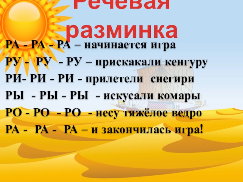 Речевая разминкаРА - РА - РА – начинается играРУ - РУ - РУ – прискакали кенгуруРИ- РИ
