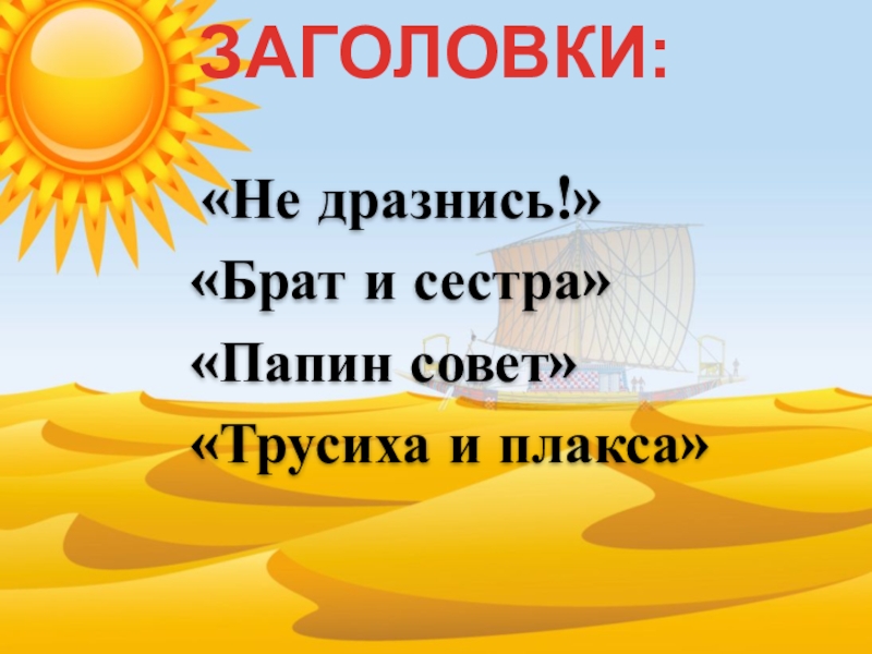 ЗАГОЛОВКИ: «Не дразнись!»«Брат и сестра»«Папин совет»«Трусиха и плакса»