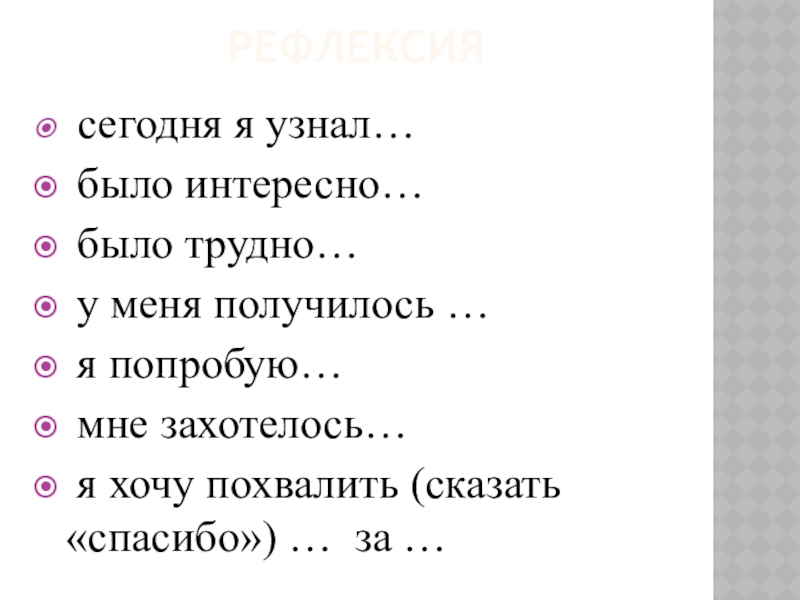 РЕФЛЕКСИЯ сегодня я узнал… было интересно… было трудно… у меня получилось … я попробую… мне захотелось… я