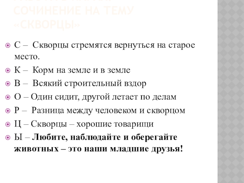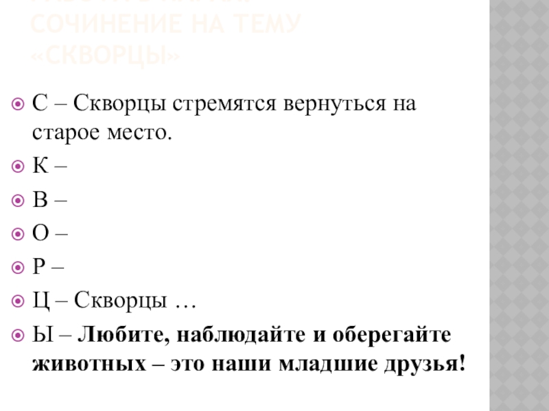 РАБОТА В ПАРАХ.  СОЧИНЕНИЕ НА ТЕМУ «СКВОРЦЫ» С – Скворцы стремятся вернуться на старое место.К –