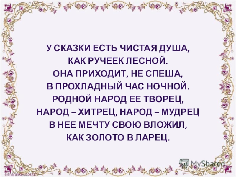 У сказки есть чистая душа, Как ручеек лесной. Она приходит, не спеша, В прохладный час ночной. Родной