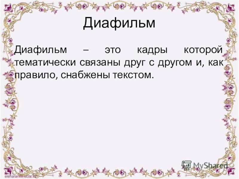 ДиафильмДиафильм – это кадры которой тематически связаны друг с другом и, как правило, снабжены текстом.