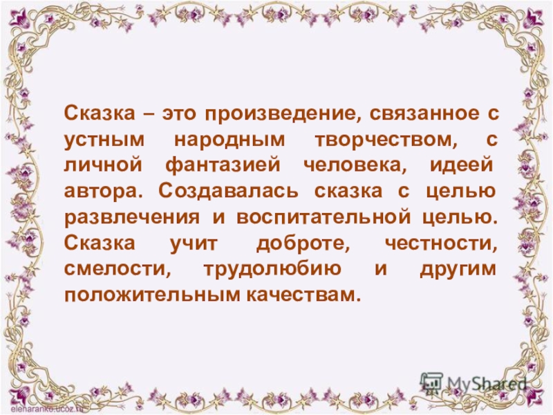 Слайд 3Сказка – это произведение, связанное с устным народным творчеством, с личной