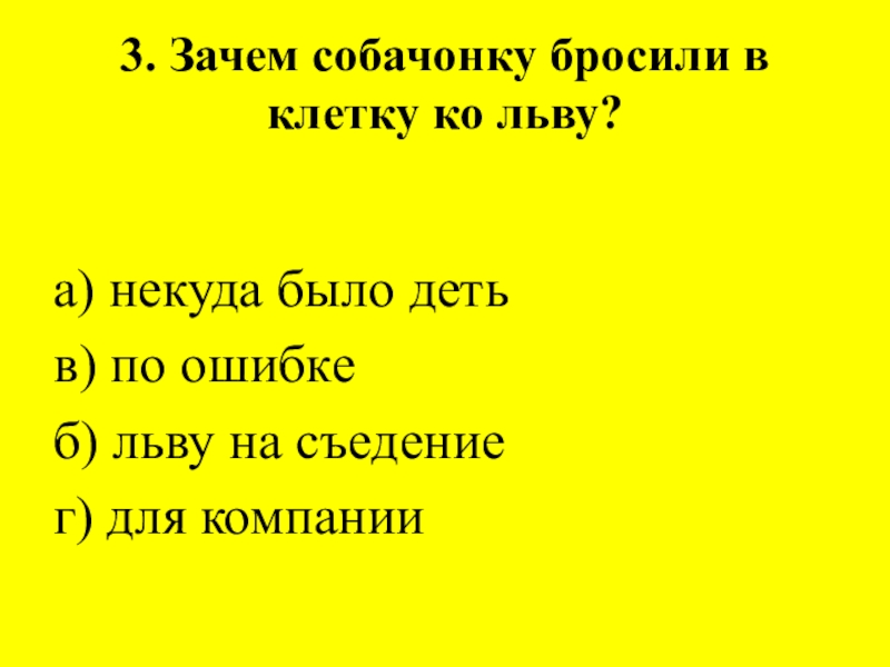 3. Зачем собачонку бросили в клетку ко льву? а) некуда было детьв) по ошибкеб) льву на съедение