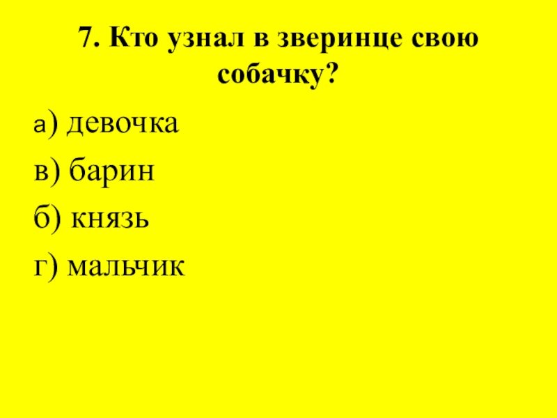 7. Кто узнал в зверинце свою собачку? а) девочкав) баринб) князьг) мальчик