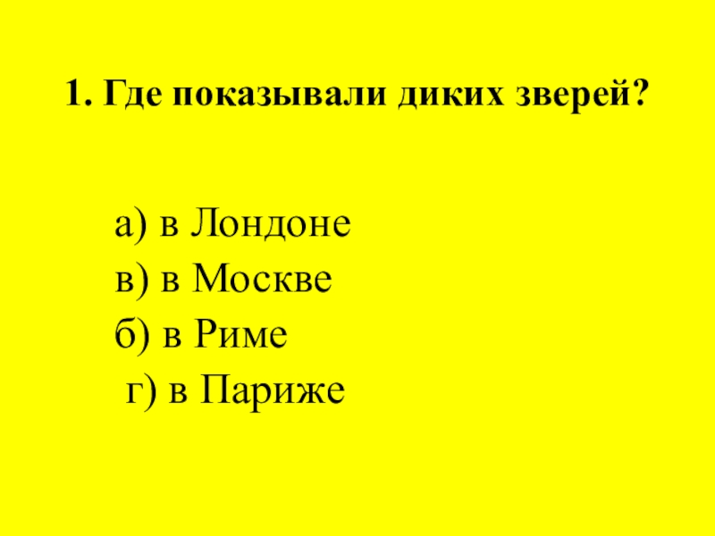 1. Где показывали диких зверей? а) в Лондоне в) в Москвеб) в Риме