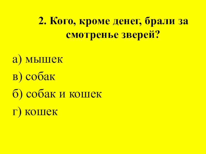 2. Кого, кроме денег, брали за смотренье зверей? а) мышекв) собакб) собак и кошек г) кошек