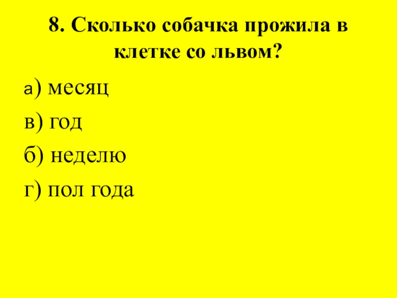 Слайд 9 8. Сколько собачка прожила в клетке со львом?