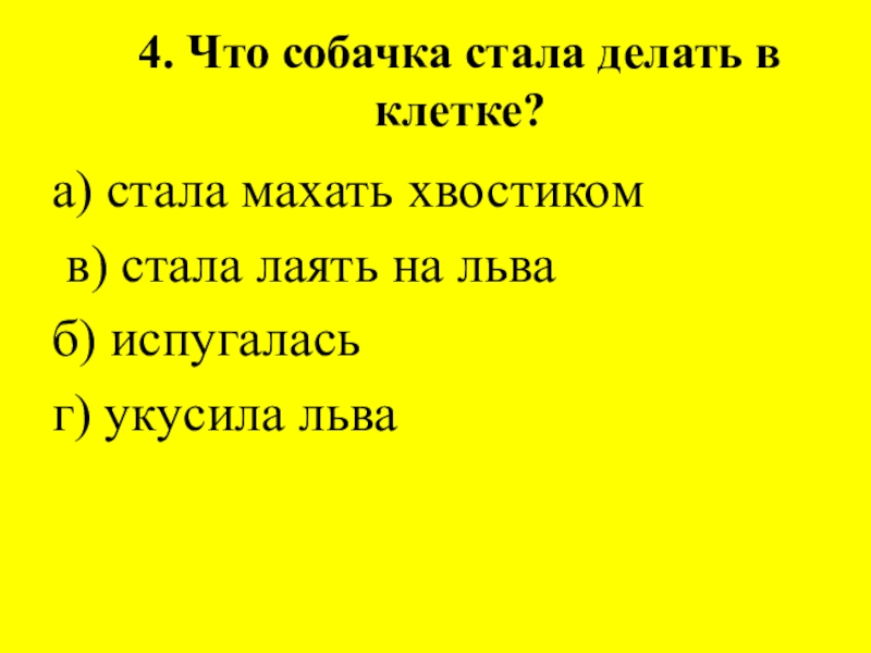4. Что собачка стала делать в клетке? а) стала махать хвостиком в) стала лаять на льваб) испугаласьг)