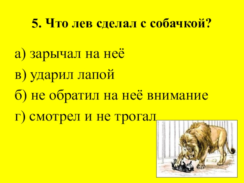 5. Что лев сделал с собачкой?а) зарычал на неёв) ударил лапойб) не обратил на неё вниманиег) смотрел