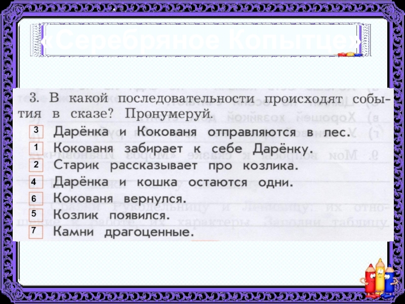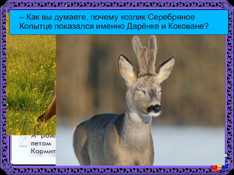особенныйпереднейсеребряноестолатоненькиелёгонькаяотменныебуренькаясеренькаятравой да листом– Как вы думаете, почему козлик Серебряное Копытце показался именно Дарёнке и Коковане?