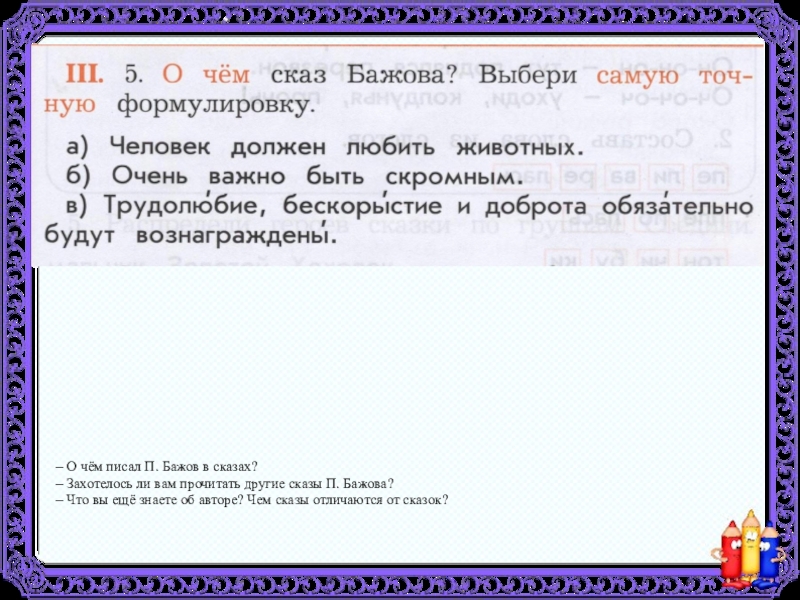 – О чём писал П. Бажов в сказах? – Захотелось ли вам прочитать другие сказы П. Бажова?