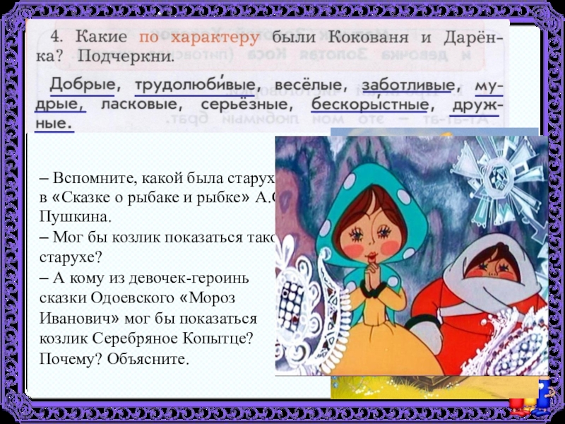 – А кому из девочек-героинь сказки Одоевского «Мороз Иванович» мог бы показаться козлик Серебряное Копытце? Почему? Объясните.