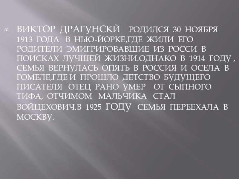 Слайд 3ВИКТОР ДРАГУНСКЙ РОДИЛСЯ 30 НОЯБРЯ 1913 ГОДА В НЬЮ-ЙОРКЕ,ГДЕ