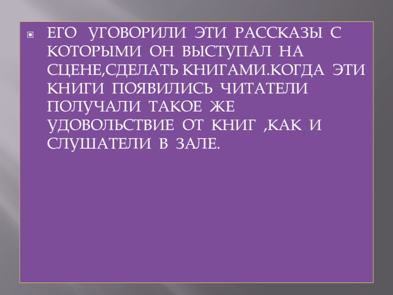 Слайд 9ЕГО УГОВОРИЛИ ЭТИ РАССКАЗЫ С КОТОРЫМИ ОН ВЫСТУПАЛ НА СЦЕНЕ,СДЕЛАТЬ