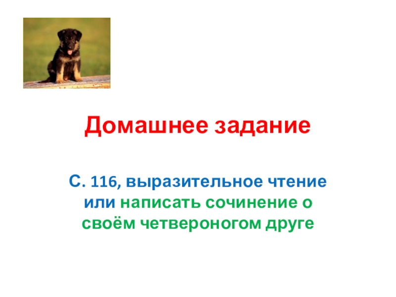 Домашнее заданиеС. 116, выразительное чтение или написать сочинение о своём четвероногом друге