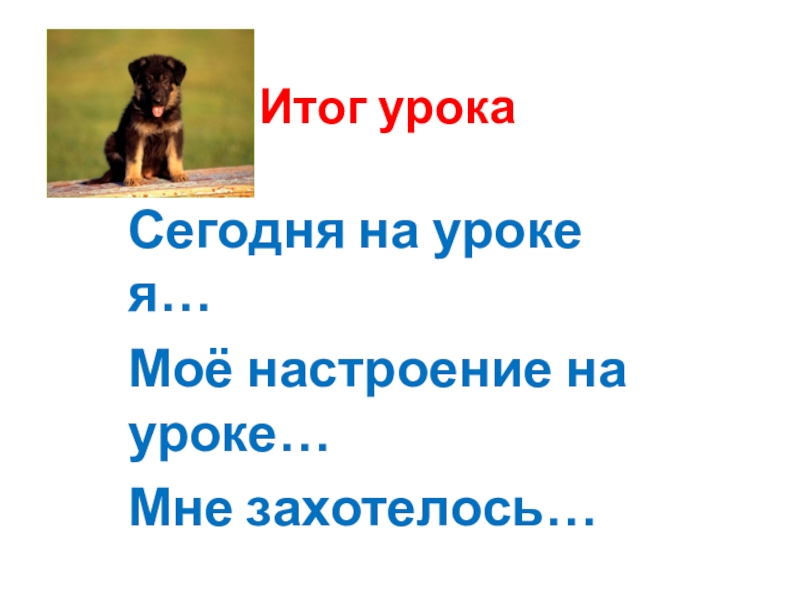 Итог урокаСегодня на уроке я…Моё настроение на уроке…Мне захотелось…