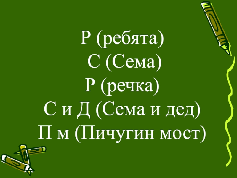 Р (ребята) С (Сема) Р (речка) С и Д (Сема и дед) П м (Пичугин мост)