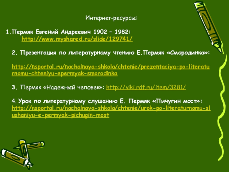 Интернет-ресурсы:Пермяк Евгений Андреевич 1902 – 1982:  http://www.myshared.ru/slide/129741/2. Презентация по литературному чтению Е.Пермяк «Смородинка»:  http://nsportal.ru/nachalnaya-shkola/chtenie/prezentaciya-po-literaturnomu-chteniyu-epermyak-smorodinka3. Пермяк