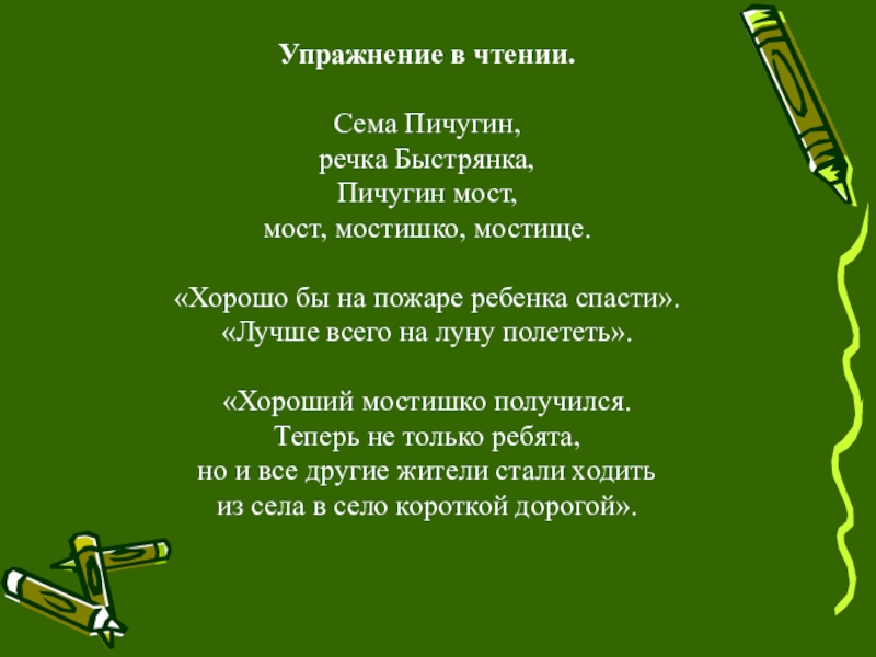 Упражнение в чтении.Сема Пичугин, речка Быстрянка, Пичугин мост, мост, мостишко, мостище.«Хорошо бы на пожаре ребенка спасти».«Лучше всего