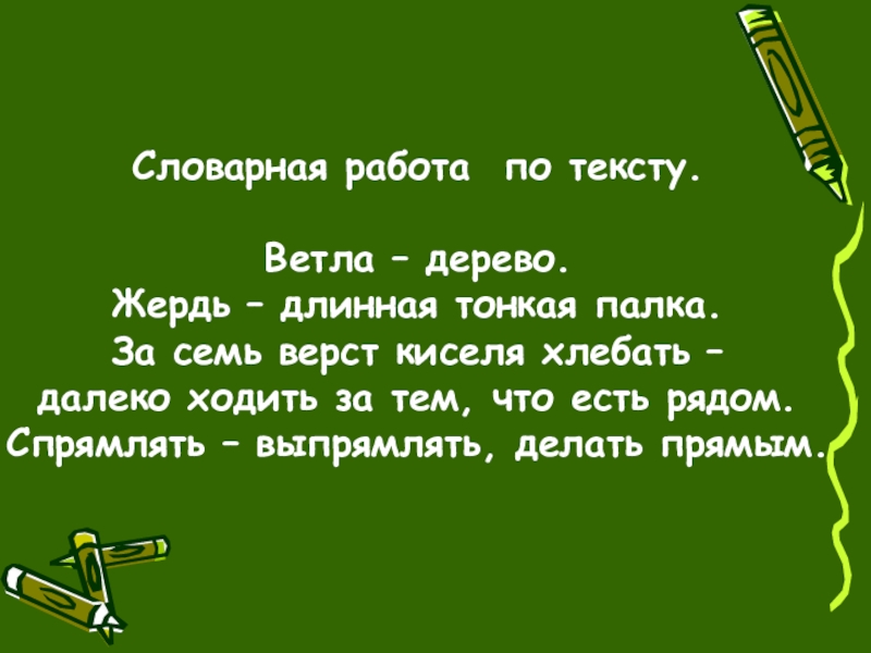 Словарная работа по тексту.Ветла – дерево.Жердь – длинная тонкая палка.За семь верст киселя хлебать – далеко ходить