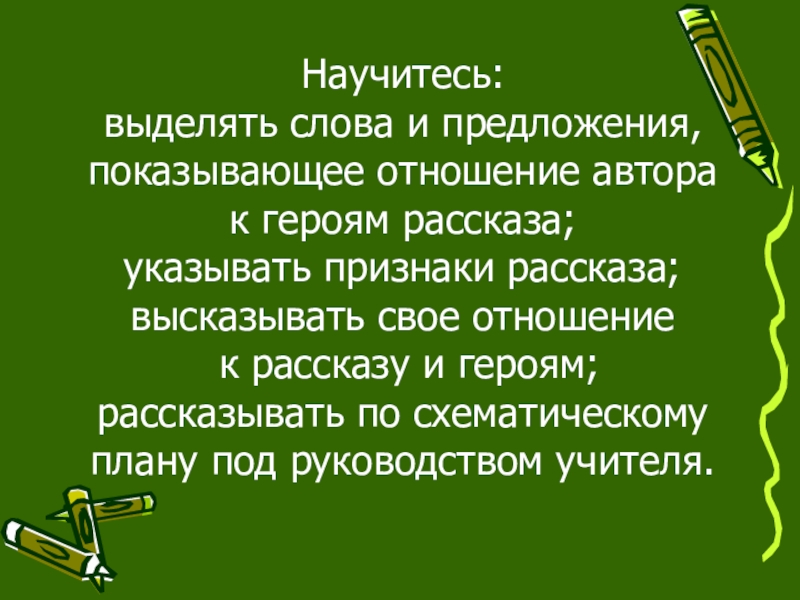 Научитесь:выделять слова и предложения, показывающее отношение автора к героям рассказа;указывать признаки рассказа;высказывать свое отношение к рассказу и