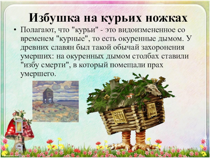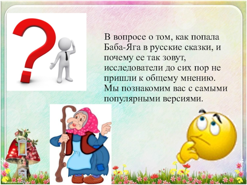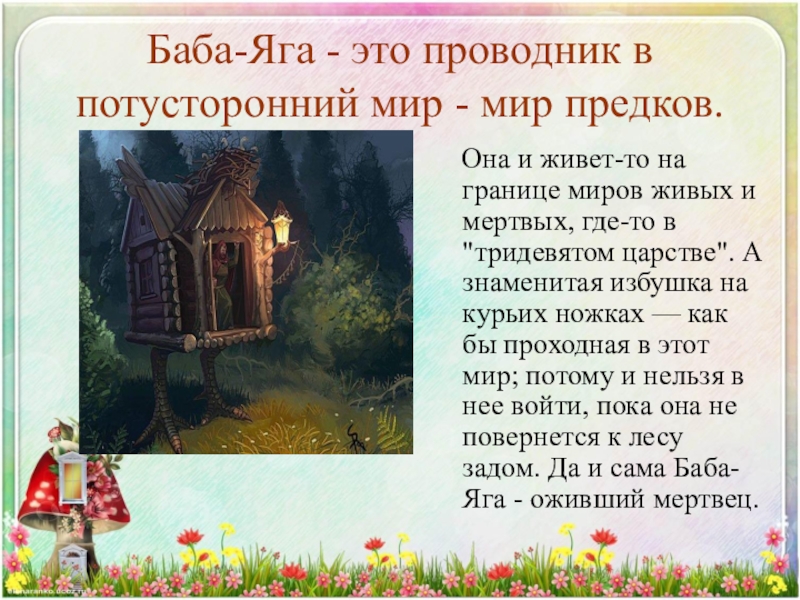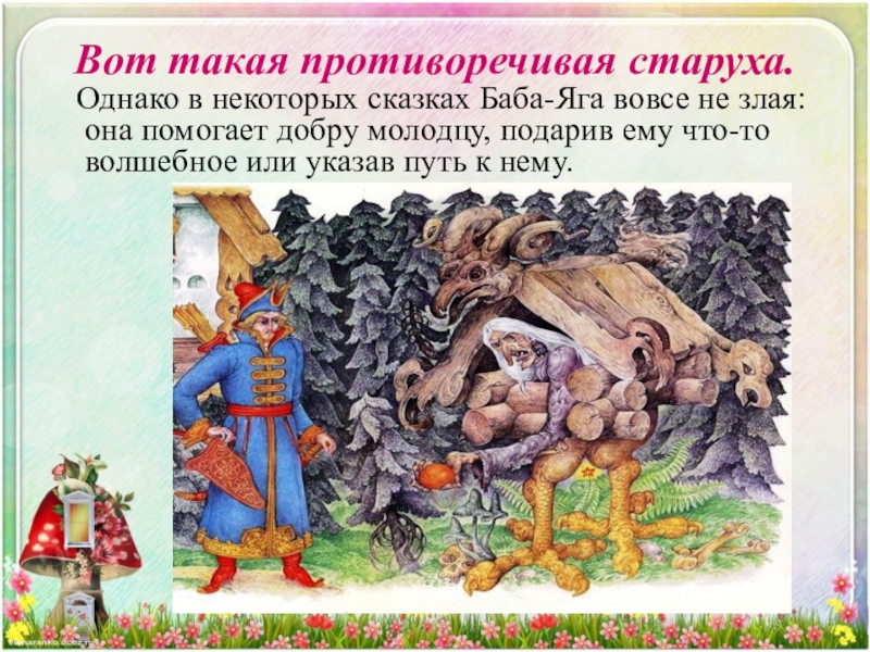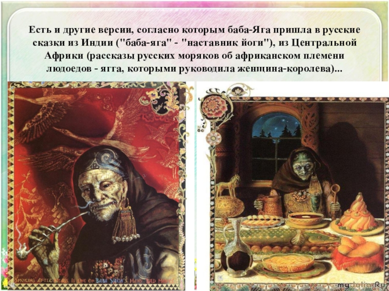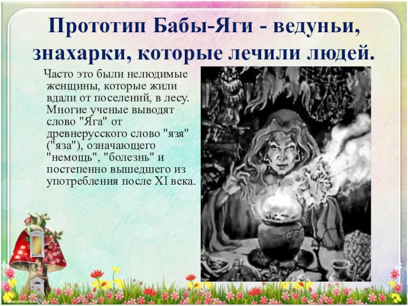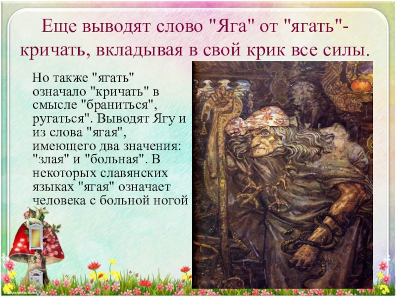 Но также "ягать" означало "кричать" в смысле "браниться", ругаться". Выводят Ягу и из слова "ягая", имеющего два значения: "злая" и "больная". В некоторых славянских языках "ягая" означает человека с больной ногой