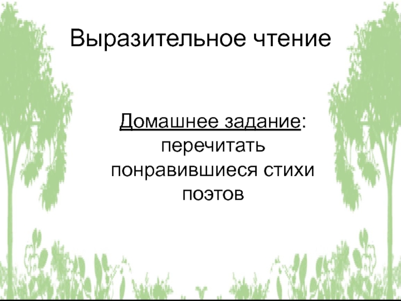 Выразительное чтениеДомашнее задание:перечитать понравившиеся стихи поэтов