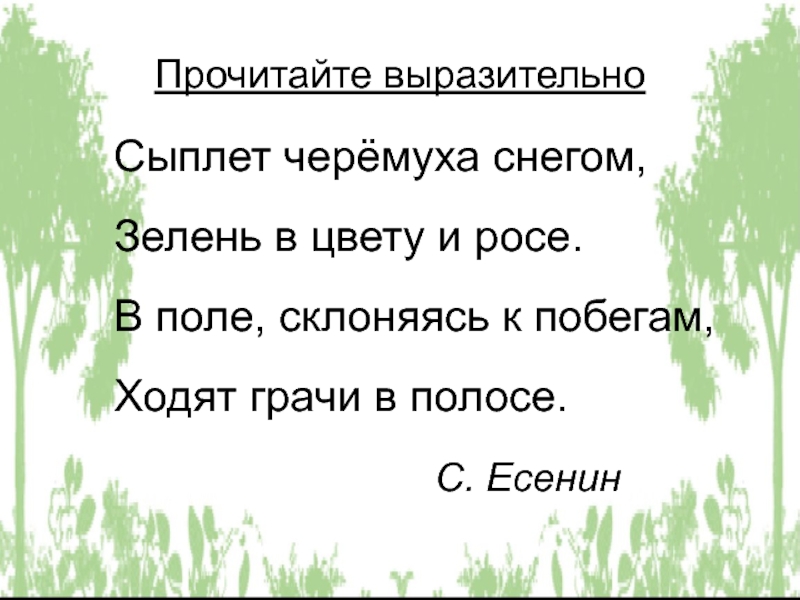 Прочитайте выразительноСыплет черёмуха снегом,Зелень в цвету и росе.В поле, склоняясь к побегам,Ходят грачи в полосе. С. Есенин