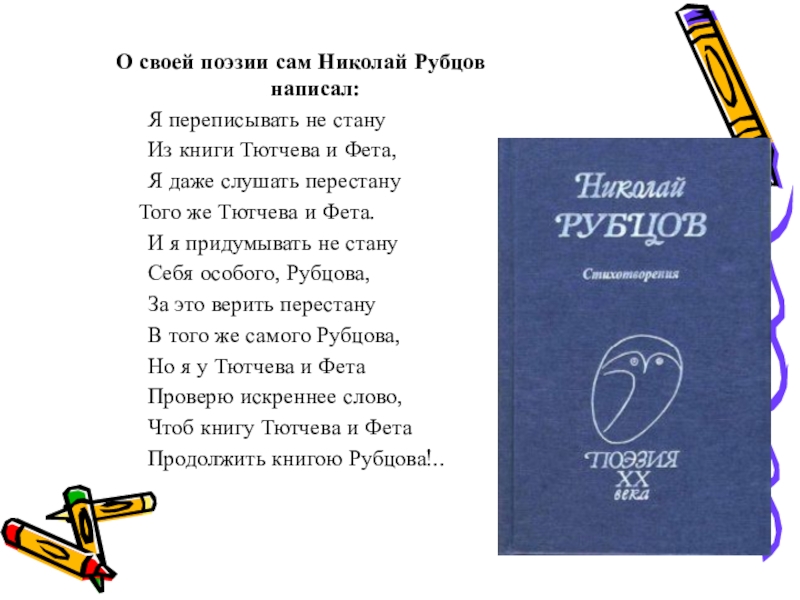 Слайд 11О своей поэзии сам Николай Рубцов написал:
