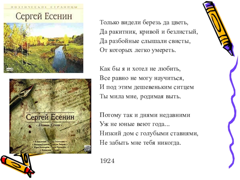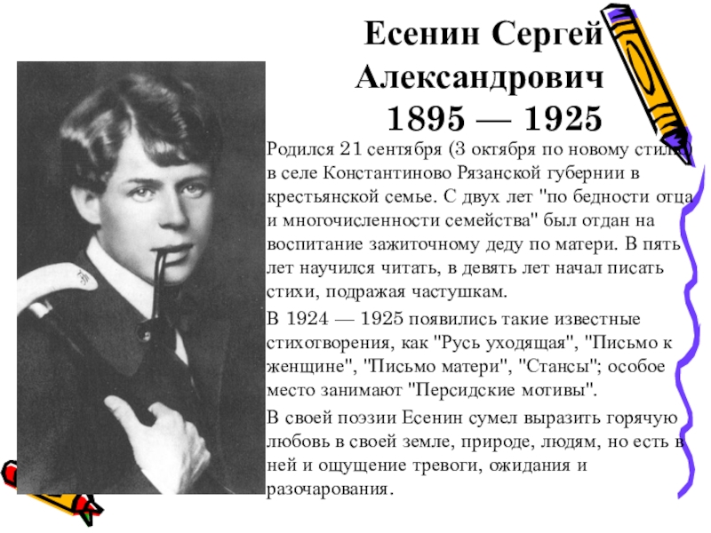 В своей поэзии Есенин сумел выразить горячую любовь в своей земле, природе, людям, но есть в ней и ощущение тревоги, ожидания и разочарования.
