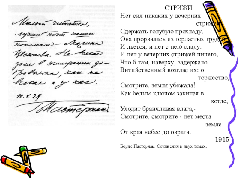 Пастернака. В поэзии (сборники "Сестра моя — жизнь", 1922, "Второе рождение", 1932, "На ранних поездах", 1943; цикл "Когда разгуляется", 1956 — 59) — постижение мира человека и природы в их многосложном единстве, ассоциативность, метафоричность, классическая поэтика. Поэмы (в том числе "Девятьсот пятый год", 1925 — 26). В повести "Доктор Живаго" (опубликована за рубежом, 1957; Нобелевская премия, 1958, от которой Б. Пастернак под угрозой выдворения из СССР вынужден был отказаться; диплом вручен сыну Б. Пастернака в 1990) – судьба русского интеллигента — героя романа— обнажены трагические коллизии революции и Гражданской войны; стихи героя романа — лирический дневник, в котором человеческая история осмысляется в свете христианского идеала. Автобиографическая проза.