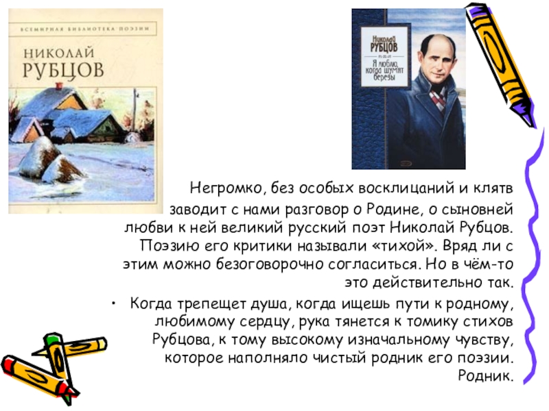 заводит с нами разговор о Родине, о сыновней любви к ней великий русский поэт Николай Рубцов. Поэзию его критики называли «тихой». Вряд ли с этим можно безоговорочно согласиться. Но в чём-то это действительно так.
