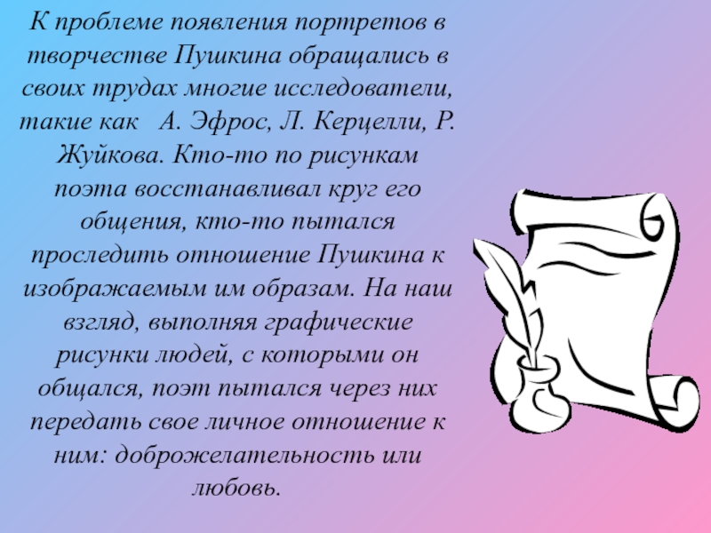 многие исследователи, такие как А. Эфрос, Л. Керцелли, Р. Жуйкова. Кто-то по рисункам поэта восстанавливал круг его общения, кто-то пытался проследить отношение Пушкина к изображаемым им образам. На наш взгляд, выполняя графические рисунки людей, с которыми он общался, поэт пытался через них передать свое личное отношение к ним: доброжелательность или любовь.