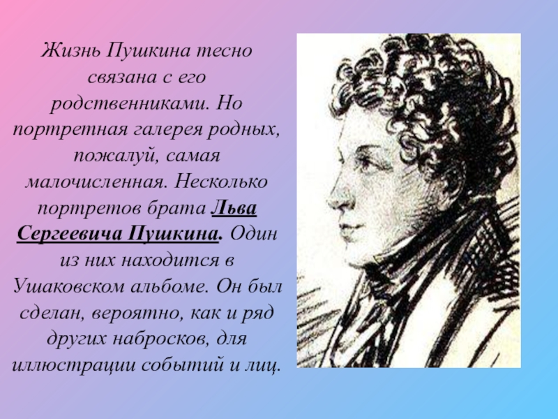 Слайд 5Жизнь Пушкина тесно связана с его родственниками. Но портретная галерея родных,