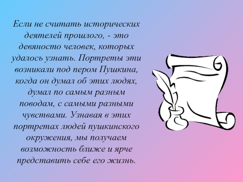 удалось узнать. Портреты эти возникали под пером Пушкина, когда он думал об этих людях, думал по самым разным поводам, с самыми разными чувствами. Узнавая в этих портретах людей пушкинского окружения, мы получаем возможность ближе и ярче представить себе его жизнь.