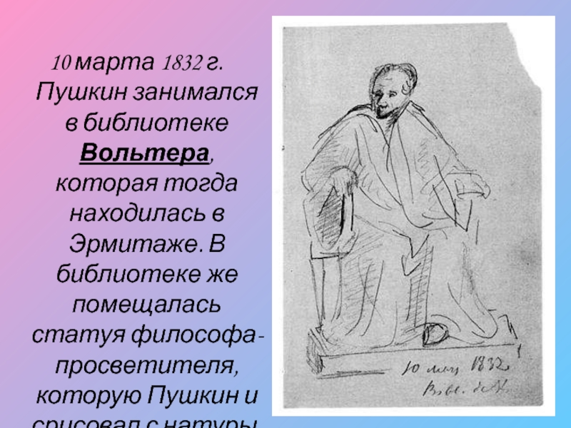Слайд 1310 марта 1832 г. Пушкин занимался в библиотеке Вольтера, которая тогда находилась