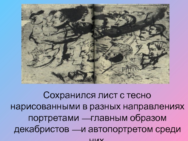 Слайд 18 Сохранился лист с тесно нарисованными в разных направлениях портретами