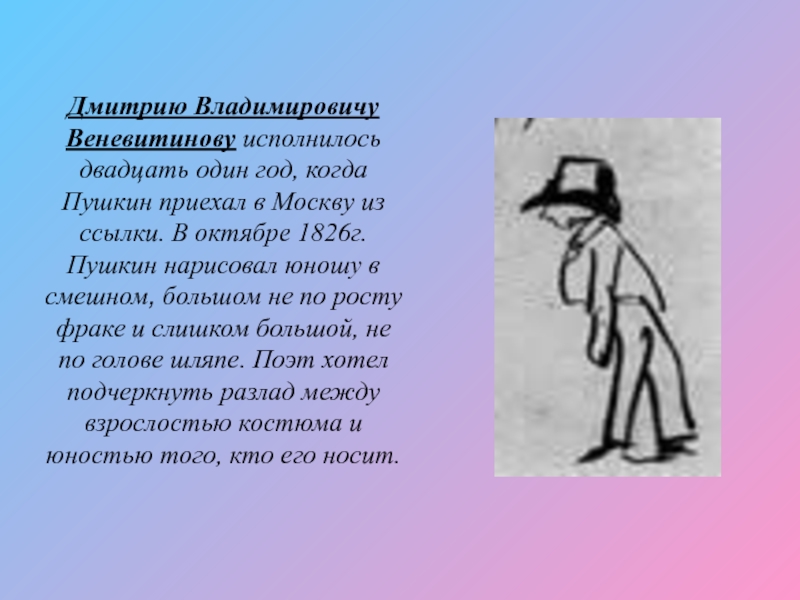 Москву из ссылки. В октябре 1826г. Пушкин нарисовал юношу в смешном, большом не по росту фраке и слишком большой, не по голове шляпе. Поэт хотел подчеркнуть разлад между взрослостью костюма и юностью того, кто его носит.