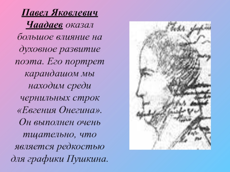 Слайд 9Павел Яковлевич Чаадаев оказал большое влияние на духовное развитие поэта. Его