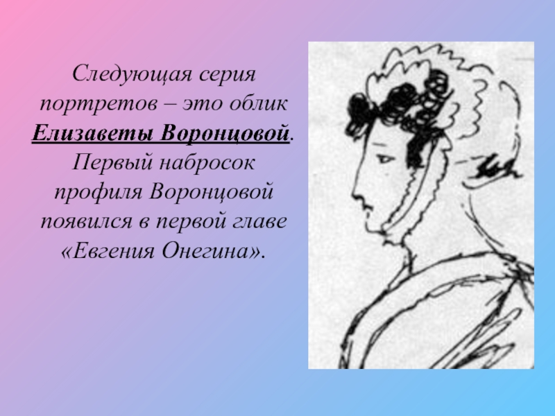 Слайд 21Следующая серия портретов – это облик Елизаветы Воронцовой. Первый набросок профиля