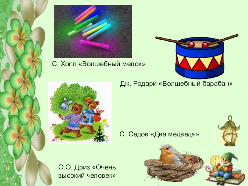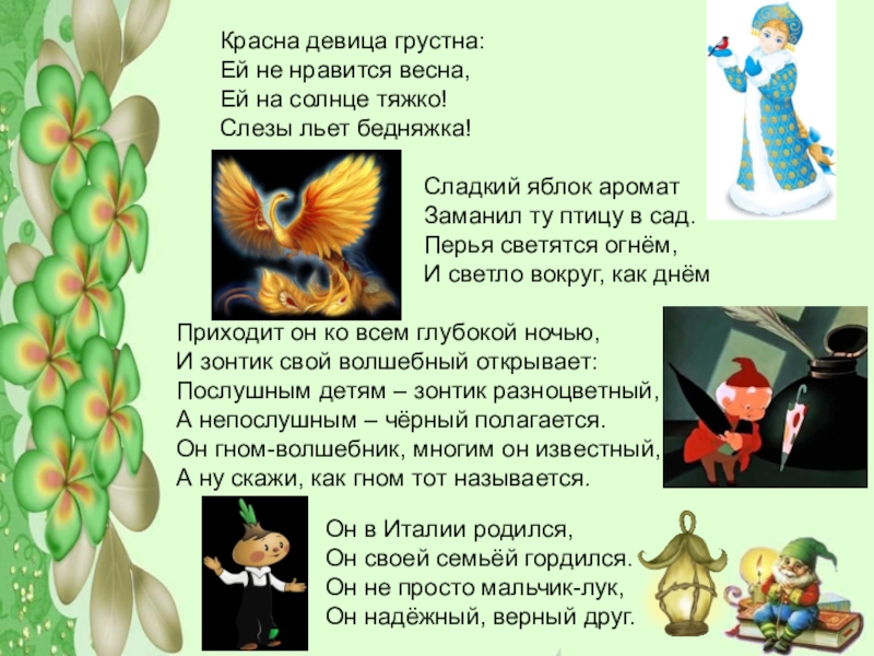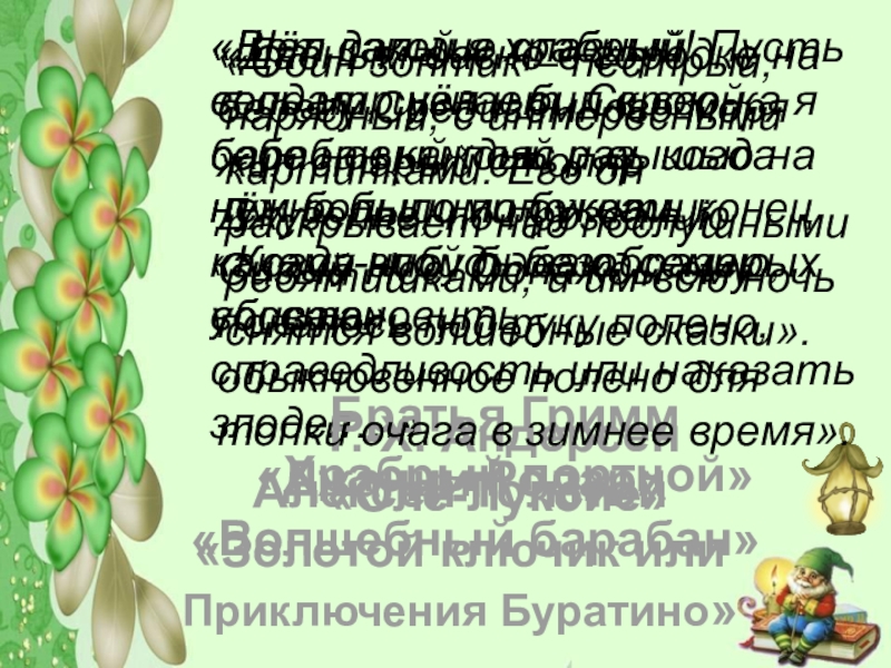 «Один зонтик – пёстрый, нарядный, с интересными картинками. Его он раскрывает над послушными ребятишками, и им всю ночь снятся волшебные сказки».