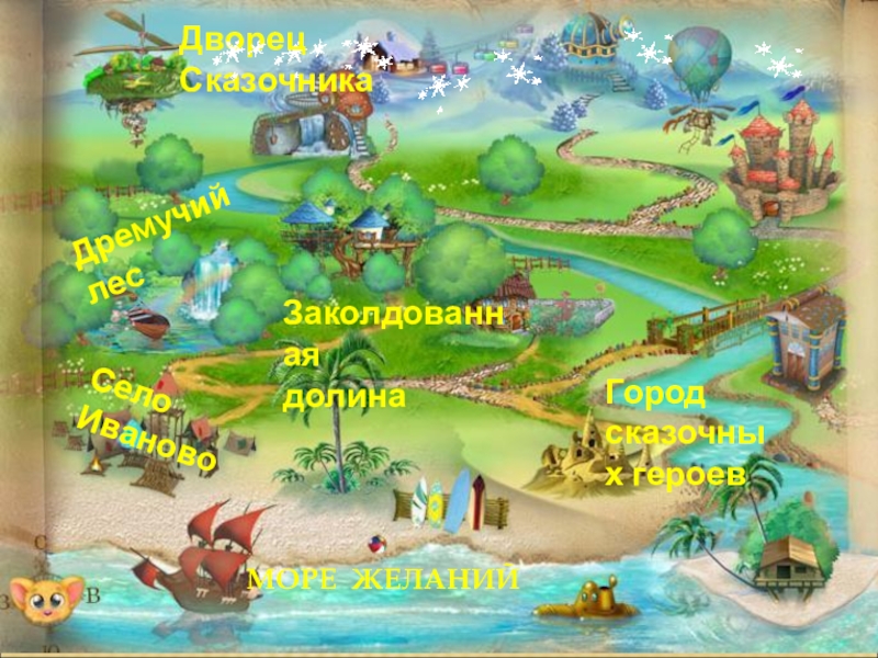 Заколдованная долинаДремучий лесСело ИвановоГород сказочных героевДворец  СказочникаМОРЕ ЖЕЛАНИЙ